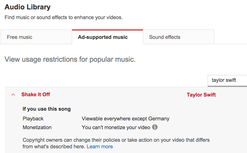 The screenshot below depicts the respective information on the song “Shake it Off” by Taylor Swift – a particulary telling example, since Swift has pulled all of her songs from the streaming service Spotify. When using Swift’s song you waive your own rights to monetize the video and it won’t be viewable in Germany (because Google has not successfully negotiated remuneration with German collecting societies such as the GEMA so far). In other words, YouTube’s Audio Library offers a one-stop shop for clearing rights of musical works, thereby allowing rights holders to grant or refuse permissions for each country individually.
