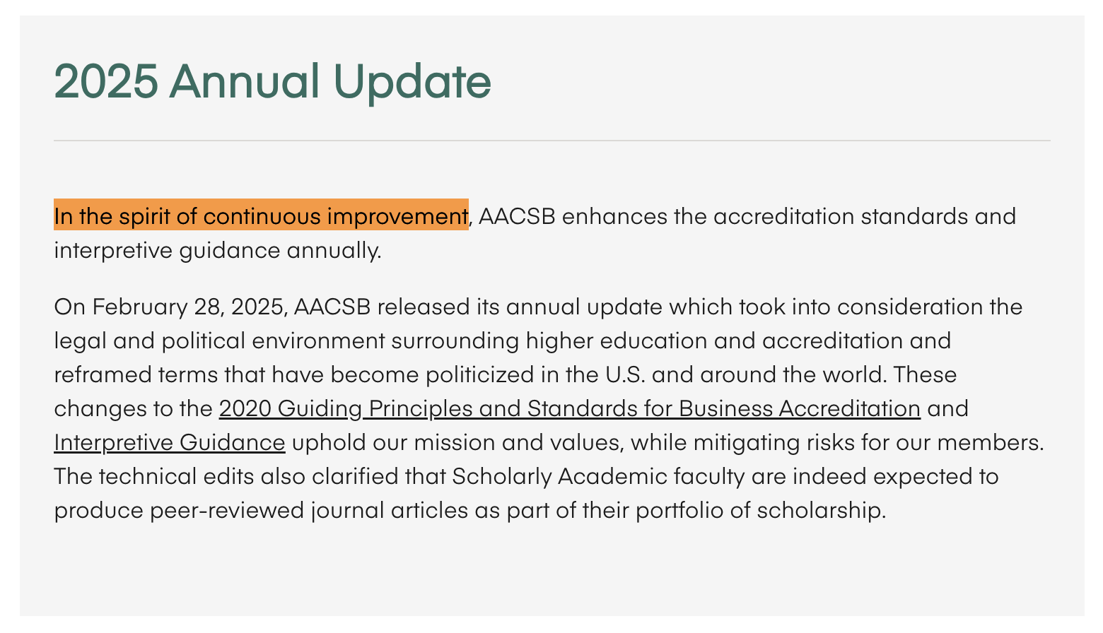 But when global accreditation of business schools immediately abandons DEI standards in anticipatory submission to an authoritarian US president announcing legally questionable decrees, then all the talk of “academic research principles” (p. 57 in the “Guiding Principles and Standards for Business School Accrediation”) is exactly that: just talk.