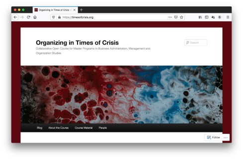 Confronted with the need to adapt teaching in the summer term to the ongoing corona cris, my colleague Elke Schüßler, who is regular contributor to this blog, and I teamed up with six other organization scholars in Germany and Austria to design a collaborative open course on “Organizing in Times of Crisis: The Case of Covid-19”. From the course description: